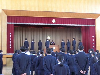 それを受け、生徒会が八幡中で実施する企画として考えたのが12月に実施した「ノーチャイムデー」です。3日間、学校のチャイムを鳴らさずに、時計を見て行動をするというもの。チャイム前着席ができたらポイントが付き、今日の生徒朝礼で4クラスの表彰が行われました。