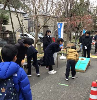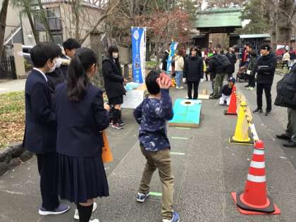 ペットボトルキャップをつめた袋をボードの穴に投げて入れるゲーム。