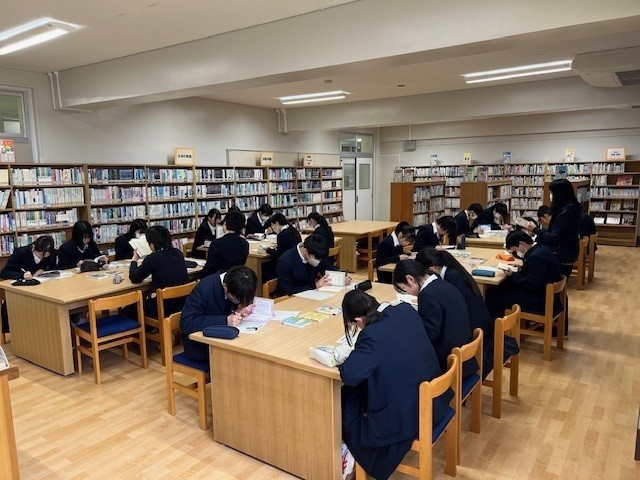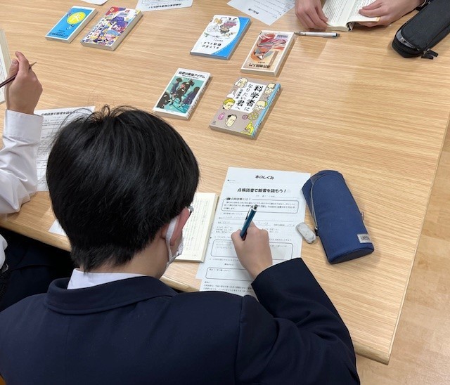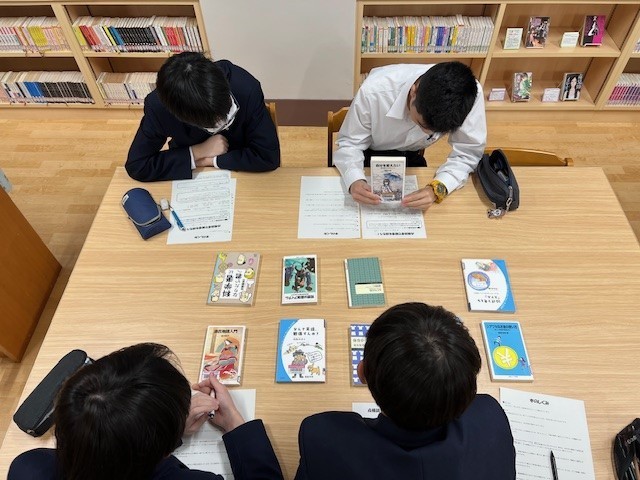 「点検読書で新書を読もう!」と銘打った活動で、読む本を決めるために短時間でポイントを絞って内容を把握するスキルを学びます。個人の活動後、担当した本についてグループ内で説明をして共有します。