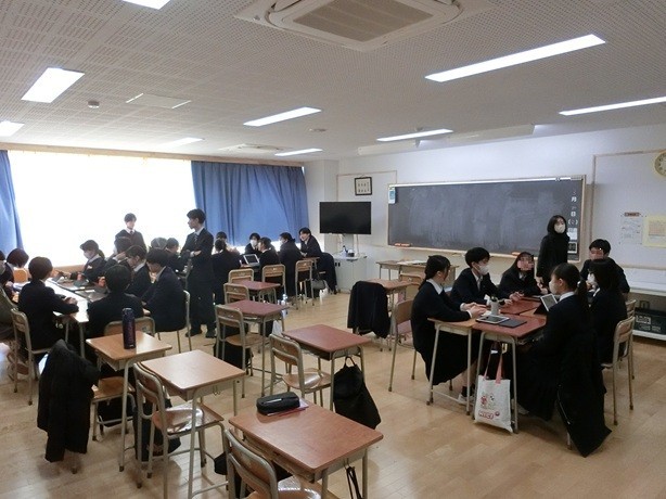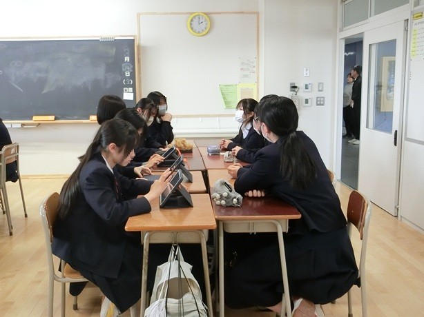 「検定は取っておいたほうがいい、英語は準2級以上は欲しい」「過去問はある程度復習が終わった最後に取り組んだほうがいい」「推薦で合格した人は、その後も勉強をしておかないと入学してから苦労すると思う」など、まさに体験したことを2年生にアドバイスしていました。2年生もタブレットで記録を取りながら真剣に話を聞いていました。