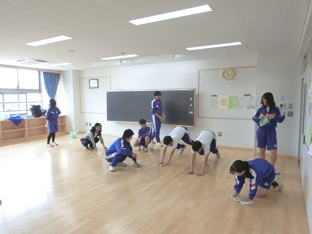 新校舎の教室の床は明るい木目調なので、ちょっとした汚れも目立ってしまいますが、それでも粘り強く念入りに取り除いています。