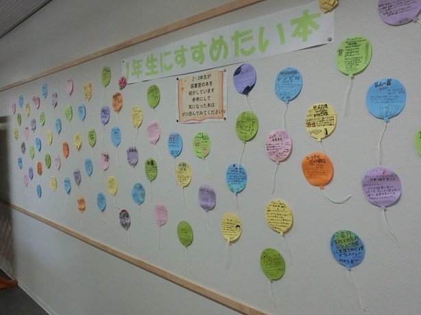 1年生の教室の前には、2・3年生からのおすすめする本の紹介が。