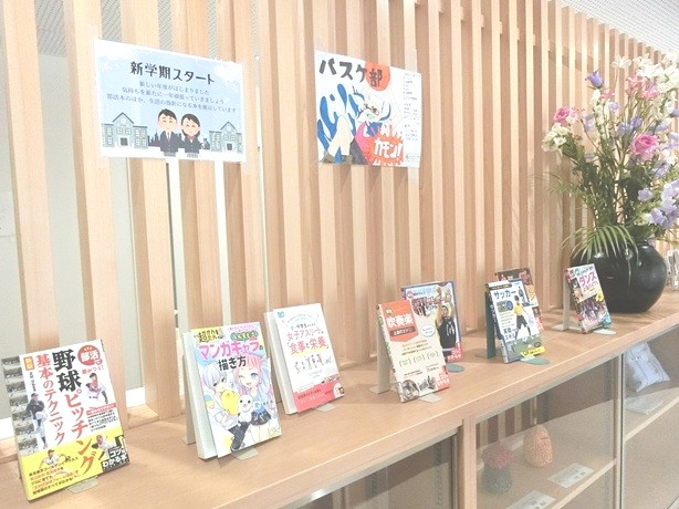 現在は新学期のスタートにあたり「部活本」「生活の指針となる本が」、隣には5月に控えた3年生の修学旅行に関連する本が並んでいます。