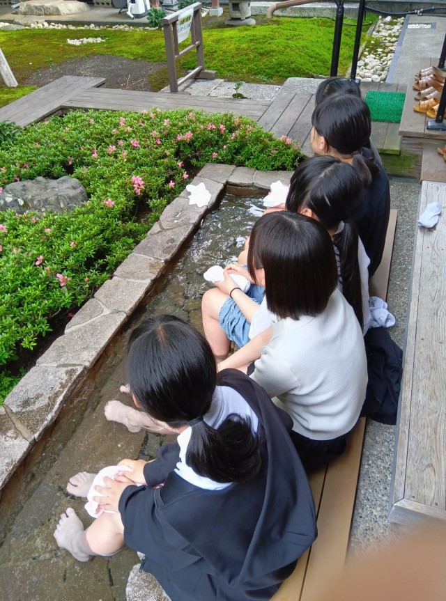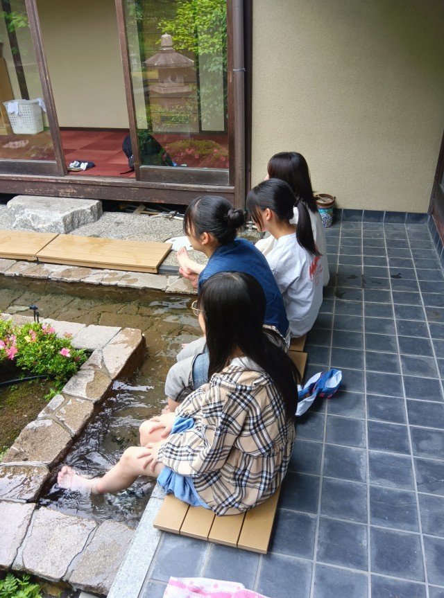 宿舎では、庭園にある足湯に浸かる生徒たちが、