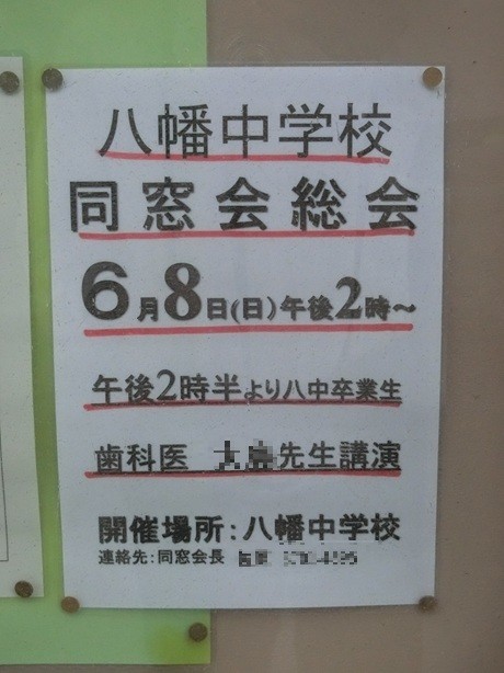 八幡中を卒業された皆様、次のとおり同窓会総会、終了後に講演会を開催いたします。