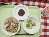 献立は「すき焼きうどん、大根と胡瓜の胡麻風味、牡丹餅、牛乳」です。今日から春のお彼岸です。春のお彼岸の行事食「牡丹餅」を作りました。お変わりじゃんけんをしているクラスもあり美味しく食べてくれたことに感...