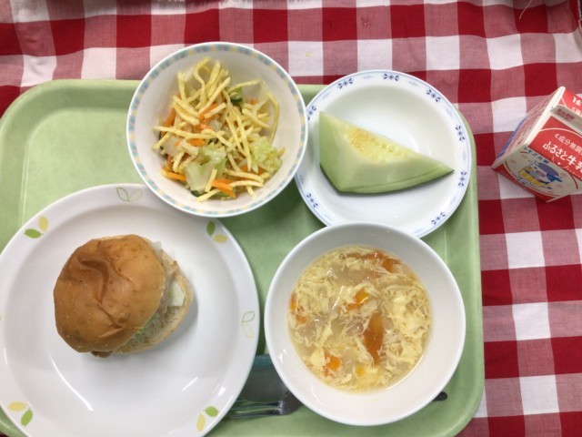「照焼チキンバーガー、パリパリポテトサラダ、卵とトマトのスープ、メロン、牛乳」です。