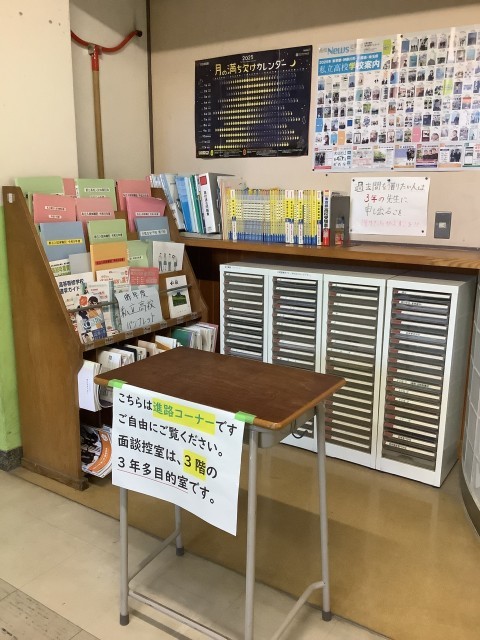 2階理科室近くに進路コーナーも用意しておりますので、三者面談等で学校にいらした際は是非ご覧ください。