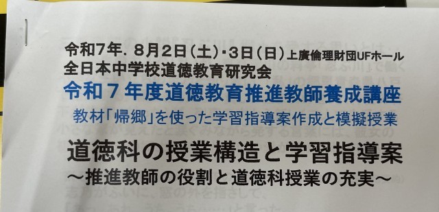 今回は、私事で恐縮ですが、8月2日(金)・3日(土)の2日間、「令和7年度 道徳教育推進教師育成講座」に参加してまいりました。