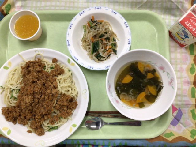「ジャージャン麺、ナムル、わかめスープ、みかんゼリー、牛乳」です。