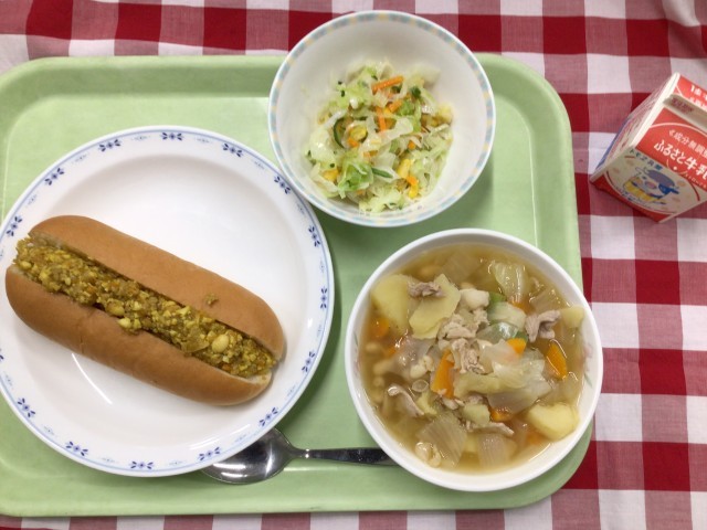「ドライカレーサンド、コールスローサラダ、白いんげん豆の田舎風スープ、牛乳」です。