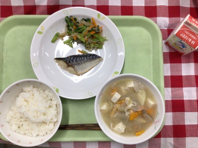「有機米ごはん、鯖の塩焼き、青菜のお浸し、豚汁、牛乳」です。