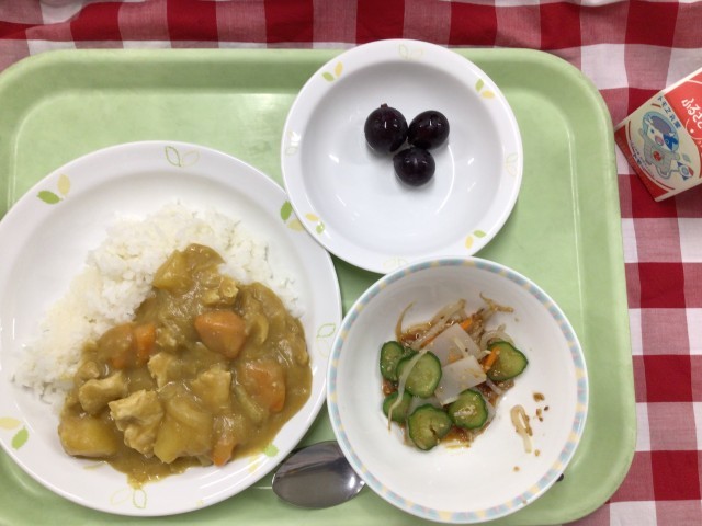 「ココナツチキンカレーライス、蒟蒻サラダ、巨峰、牛乳」です。