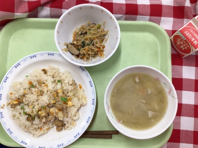 「そぼろごはん、切干大根の煮付け、さつま汁、牛乳」です。