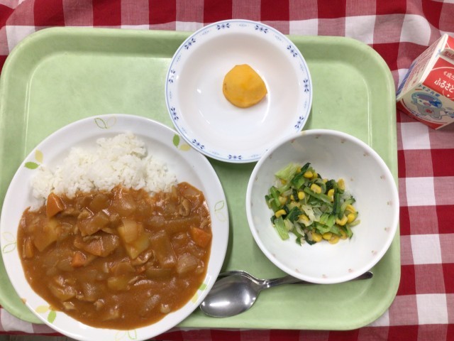 「ハッシュドポークライス、小松菜サラダ、柿、牛乳」です。