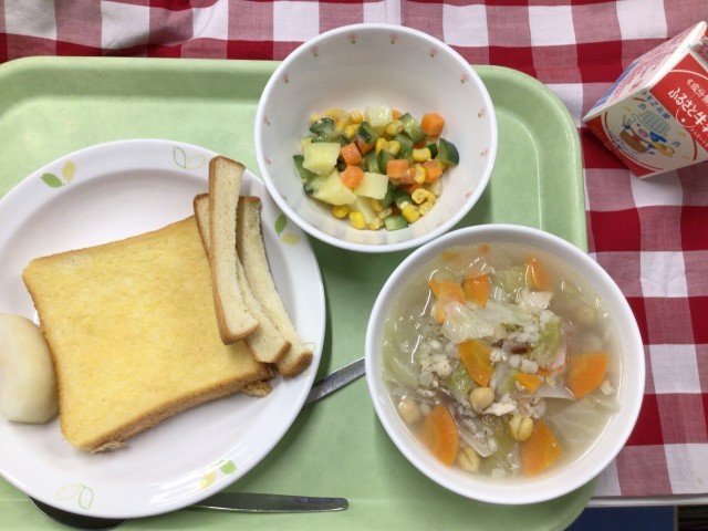 「豆乳フレンチトースト、マセドアンサラダ、スコッチブロス、梨、牛乳」です。