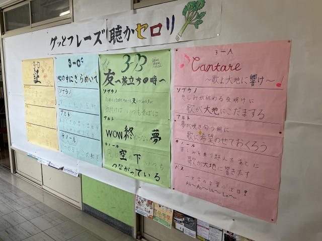 写真の模造紙は、代表委員会の企画「グッとフレーズ 聴かセロリ!」です。