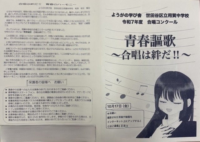 いよいよ明日、令和7年度用賀中学校合唱コンクールが開催されます。今年のテーマは「青春謳歌 ~合唱は絆だ!!~」。各クラスがこのスローガンのもと、放課後や音楽の時間に一生懸命練習を重ねてきました。