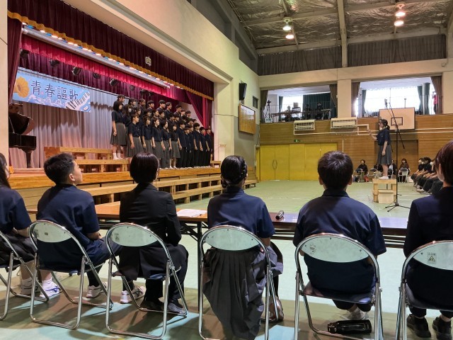10月17日に行われた合唱コンクールは、どのクラスも熱い歌声が体育館に響いた、素晴らしい1日でした。2年生は用賀中学校でもっとも人数の少ない学年ですが、他の学年に負けない圧倒的な歌声で歌いました。これまでの練習は、うまくいかないこともあったことでしょう。それでも、諦めずに仲間と励まし合いながら取り組んできました。その成果が見事なハーモニーとなっていました。まさに青春謳歌。今年のスローガン通りの合唱コンクールとなりました。美しい合唱となるためには、誰か1人の力だけでは到達できません。みんなの力を合わせてこそ奏でられるものです。金賞受賞の2年B組、銀賞受賞の2年D組だけでなく、2年A組、2年C組も素晴らしい歌声でした。2年生のパワー溢れる合唱に、一人一人の成長を感じました。これからの生活でも、仲間との絆を大切にしていきましょう。