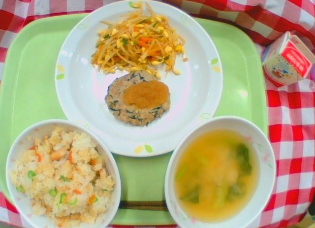 「子ぎつねごはん、ひじきと蓮根の和風ハンバーグ、もやしのコチジャンかけ、じゃが芋の味噌汁、牛乳」です。