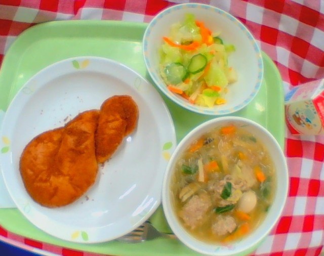 「シナモン揚げパン、ポテト入りフレンチサラダ、肉団子入り春雨スープ、牛乳」です。