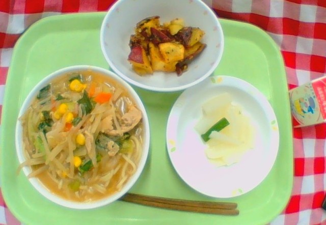 「味噌ラーメン、大根の甘酢かけ、大学芋、牛乳」です。