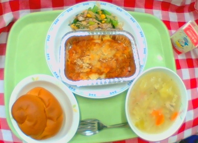 今日の主菜は、蒸したポテトにミートソースを載せてオーブンで焼いたグラタンです。ミートソースをホワイトソースやブラウンソースに変えたり、ポテトをマカロニやチキン、シーフード、野菜などに変えることで、レパートリーを広げていけるメニューです。給食でも、いろいろなパターンを楽しめるよう試行錯誤していきたいと思います。