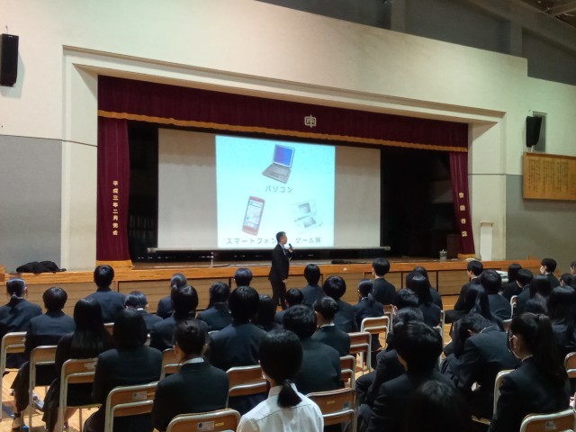 講演では、SNSでのちょっとした気の緩みが大きなトラブルにつながること、そして相手を思いやらない言葉が人を深く傷つけてしまうことについて、具体的な事例を交えてお話しいただきました。炎上や誹謗中傷は、ほんの一言から始まることがあります。生徒のみなさんには、投稿する前に「この言葉で誰かが傷つかないか」を考える習慣を身につけてほしいと思います。