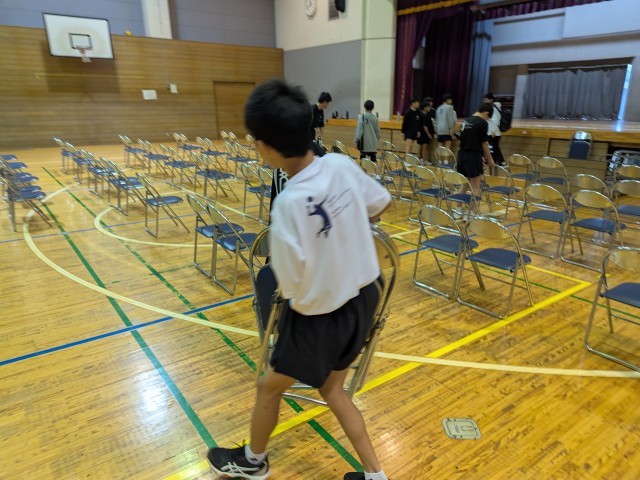 体育館を会場としましたが、開演前までは男女バレーボールが練習を行っておりました。その後、椅子を並べるのは吹奏楽部員が行うはずでしたが、バレーボール部員が練習後に気がついてくれ、進んで並べてくれました。その積極性と暖かな気持ちに、用賀中学校の教育目標である「自立、敬愛、精励」の具体的な姿を感じ、大変嬉しく思いました。