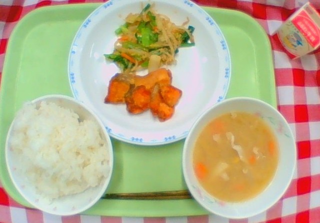 「ごはん、鮭ザンギ、野菜の胡麻和え、北海道味噌汁、牛乳」です。