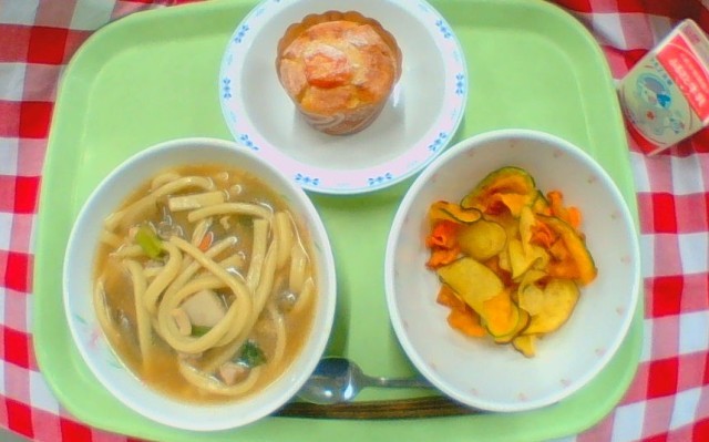 「冬至うどん、野菜チップ、冬のカップケーキ、牛乳」です。