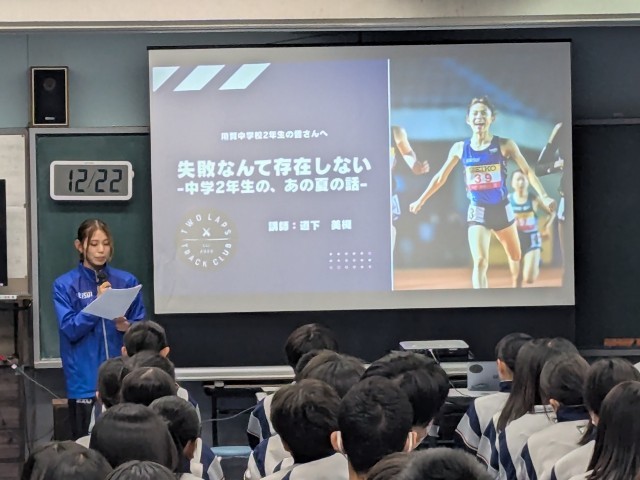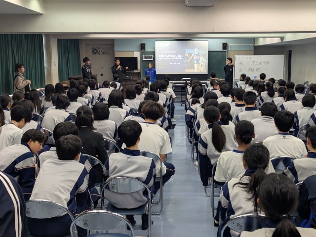 本日はオリンピックレガシー教育として陸上競技選手である道下美槻(みちした みづき)選手にご来校いただきました。道下選手から、競技選手になるまでのきっかけや、その時の苦労、その際の対策や練習法など教え ていただきました。