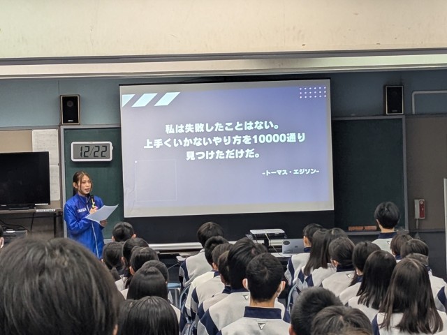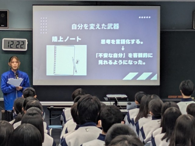 生徒からも積極的に質問があり、苦しい時や困った時にどのように克服しているかなど、主体的に聞き取る様子が伺えました。