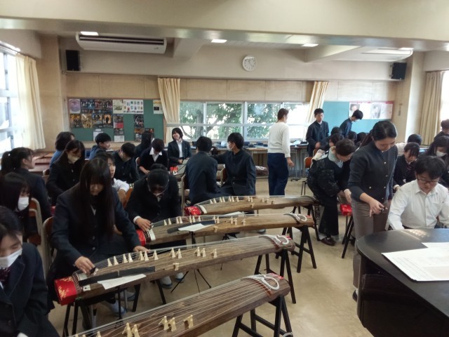 続いて音楽の授業では、YCCのお琴の先生をお迎えし、1年生が日本の伝統楽器に触れる時間を過ごしました。みんなが知っている「さくら」の曲を順番に聴きながら、その音色や歴史について理解を深めていました。実際にお琴に触れることで、日本文化の奥深さを感じる貴重な機会となりました。