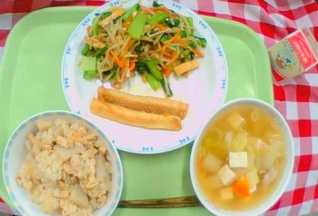 「里芋ごはん、いかの香味焼き、煮浸し、豆腐汁、牛乳」です。