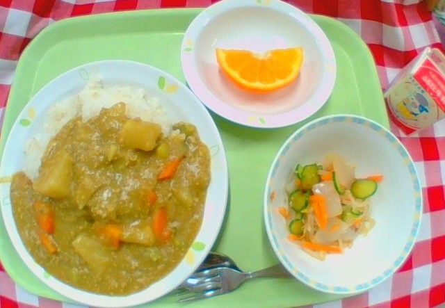 「せたがやカレーライス、蒟蒻サラダ、いよかん、牛乳」です。