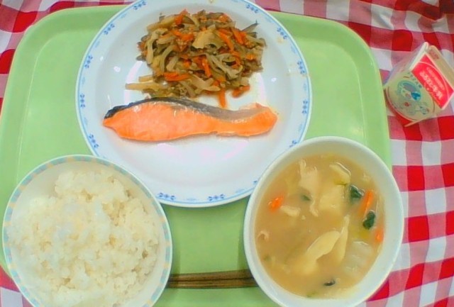 学校給食週間献立2回目は、初めての給食の献立に登場した「鮭の塩焼き」を主菜に献立を立てました。当時の子どもたちもこんな気持ちだったんだろうなと思わせてくれるほどに美味しく作っていただきました。