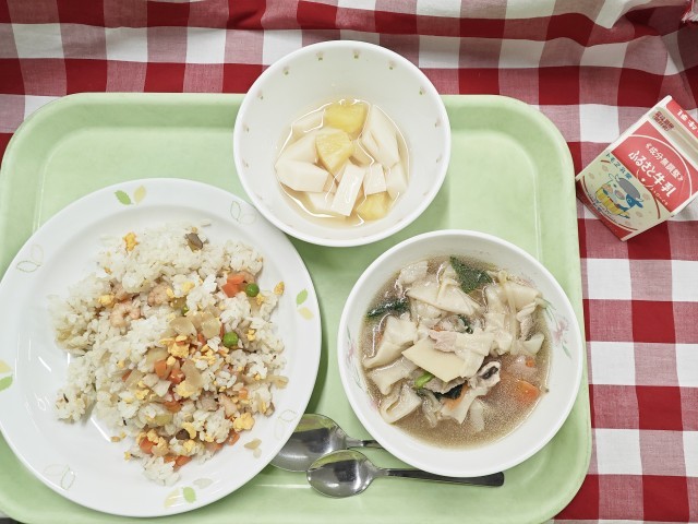 学校給食週間最終日は、日頃より給食でもお世話になっている中華料理(日式中華料理)より、今年大人気の「わんたんスープ」を中心に献立をたてました。身体の中から温まりました。