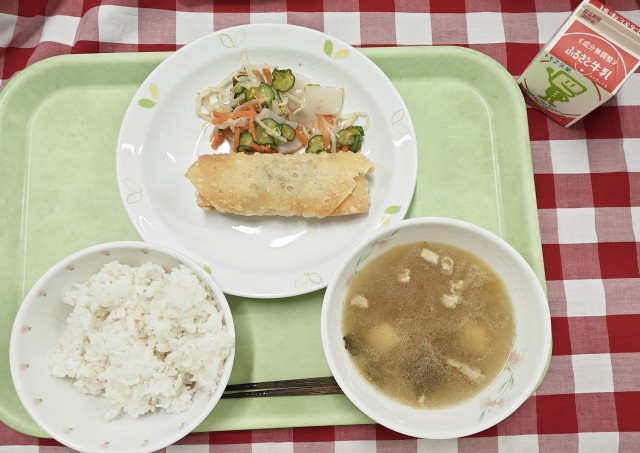 「麦ごはん、春巻き、蒟蒻サラダ、わかめスープ、牛乳」です。