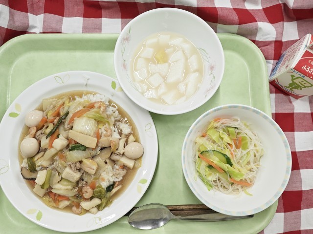 「中華丼、春雨サラダ、牛乳寒天、牛乳」です。