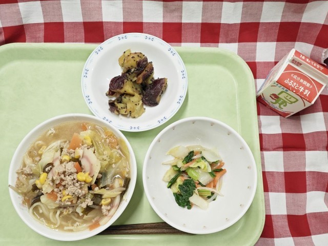 「味噌わかめラーメン、中華サラダ、大学芋、牛乳」です。