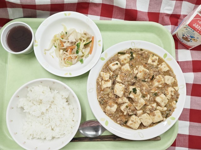 「ごはん、麻婆豆腐、白菜の中華サラダ、ぶどうゼリー、牛乳」です。