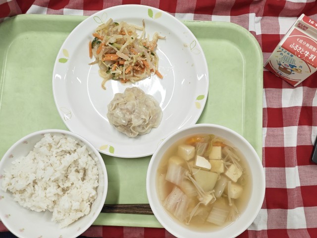 「麦ごはん、ジャンボ焼売、野菜の胡麻酢和え、豆腐汁、牛乳」です。