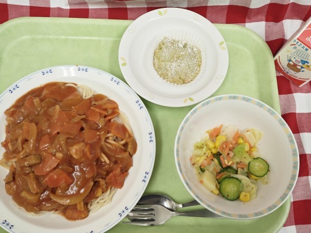 今日の配膳は、スパゲティとソースの量のバランスが難しかったようです。毎日同じものを配膳するわけではないので、なかなか習得するのは難しいですが、サンプルや給食メモの写真を参考に上達を目指して欲しいと思います。