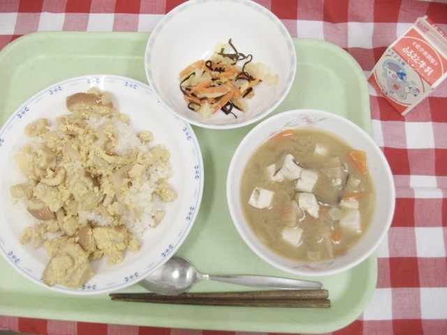 「フーチャンプル丼、野菜の塩昆布和え、粕汁、牛乳」です。