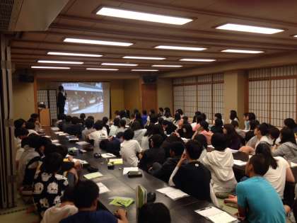 商人体験も無事終了しました。夕食後、明日の班行動のためのガイダンス中です。