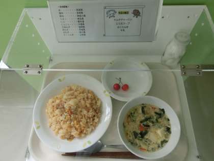 キムチチャーハン・にら玉スープ・さくらんぼ・牛乳