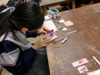 写真は工芸高校「名作いす」の模型作成です。細かい木材を丁寧に貼り付けていきます。