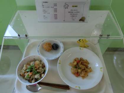 きのこおこわ・凍り豆腐とじゃが芋のそぼろ煮・いが栗ぼうや・プルーン・牛乳