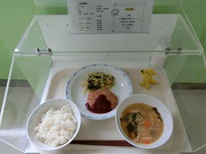ご飯・八丈島産むろあじバーグ・野菜のかつお風味・きのこの味噌汁・牛乳